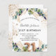 Zum 21. Geburtstag Party. Weiß, mit Eukalyptusgrün und goldenen Blätter dekoriert. Golden Imitats Glitzer Spots. Personalisieren und fügen Sie Ihre Namen und Hochzeitsdetails. Schwarze und goldfarbene Buchstaben. Nummer 21 wird mit Schriftart im Ballonstil geschrieben. Zurück: weißer Hintergrund und goldene Imitate Glitzer Flecken.