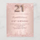 Ein modernes, stilvolles und glamouröses Party zum 21. Geburtstag. Ein Imitat Rose gold metallische Hintergrund mit einem eleganten Imitat Rose Gold Glitzer Tropfen, Farbe Tropfen aussehen. Der Name ist mit einer modernen dunklen Rose goldfarbenen Handschrift geschrieben, die als Stilschrift dient. Personalisieren Sie Ihre Party-Daten und fügen Sie sie hinzu. Nummer 21 wird mit einem Schriftart im Ballonstil geschrieben, Skript.