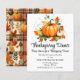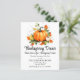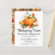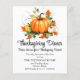Eine Niedliche Erntedank-Illustration mit Kürbissen und bunten Herbstblättern auf der einen Seite und Herbstpflaster mit Blätter und Kürbissen auf der anderen Seite. Sie können diese Einladung mit Ihren Dinner-Details personalisieren.