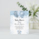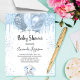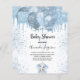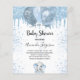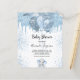 Für eine Babydusche, Feiern eines kleinen Jungen. Ein schick weißer Hintergrund. Dekoriert mit blauen Imitaten Glitzer Tropfen, Farbe Tropfen aussehen, Ballons und ein niedlicher kleiner Elefant Junge. Personalisieren und fügen Sie den Namen der Mutter zu sein Name und Party Details. Der Name und der Text: Baby Shower wird mit einem handgeschriebenen Stift geschrieben