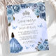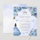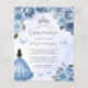 Diese schöne Quinceañera Einladung zeigt eine Grenze von blauen Rose mit silbernen Imitaten Glitzer Blattwerk auf einem blauen Aquarell. Ein silberner Tiara, ein dunkelhaariges Mädchen in einem blauen Prinzessenkleid und kleine blaue Schmetterlinge schmücken den Text. Das Wort "Quinceañera" und der Name des Ehrengast erscheinen in silbergrauem Schriftsatz, der Rest in Holzkohle grau sans serif Schriftart.