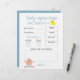 Eine preiswerte Spielart von Babyprognosen und Ratschlägen für die Eltern. Papierblätter mit einem Quiz, das Ihre Gäste spielen können. Design in Blau und Weiß für eine Babydusche mit niedlichen Illustrationen. Anpassen oder ändern Sie den Schriftart, die Farben und den Wortlaut, indem Sie auf die Schaltfläche klicken, um das Design zu bearbeiten.