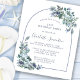 Dusty blaue Pfingsten und Wildblumen schmücken eine hübsche Geburtstagseinladung. Moderne Kalligraphie und der Bogen ergänzen das Boho Vibe.