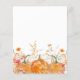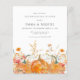 Lebhafte orangefarbene Kürbis sind umgeben von zarten Wildblumen im Herbst. Weich grauer Text verleiht ihm eine einfache und moderne Ästhetik.