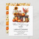 Eine Niedliche Erntedank Illustration mit einem Korb mit Kürbis, Sonnenblumen, Mais und Weizen auf der Vorderseite und bunten rosa Orangenkürbis auf der Rückseite. Sie können diese Einladung mit Ihren Dinner-Details personalisieren.