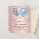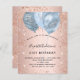 Für einen eleganten 21. Geburtstag (oder jedes Alter). Eine Rose Gold Imitat Hintergrund. Mit Rose Gold, rosa Tropfen, Tropffarbe und blauen Ballons dekoriert. Personalisieren und fügen Sie einen Namen, Alter 21 und Party-Details. Der Name wird mit einem handgeschriebenen Stilskript geschrieben.