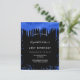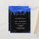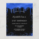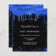 Eine mädchenhafte und weibliche 21. (oder jedes Alter) Geburtstagsfeier Einladung. vorne: Ein schicker schwarzer Hintergrund. Dekoriert mit königsblauen Imitaten Glitzer Tropfen, Farbe Tropflook. Personalisieren und fügen Sie einen Namen und Party Details hinzu. Der Name wird mit einem handgeschriebenen Stilskript geschrieben.