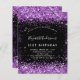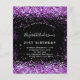 Eine moderne, stilvolle und glamouröse Einladung für eine 21. Geburtstagsfeier (oder jedes Alter). Ein schwarzer Hintergrund mit lila Imitaten Glitzer Staub. Der Name ist mit einem modernen handgeschriebenen Stilskript geschrieben. Personalisieren Sie Ihre Party-Daten und fügen Sie sie hinzu.