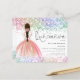 Multicolor Glitzer Gown Quinceanera Einladung. Ein Preis SMALLER 4,5" x 5,6" Alternative. Erhältlich in einem SEMI GLOSS 110lb CARD STOCK, der die Standardoption (dicker für Einladungen) ist, ODER einem SATIN FINISH 80 lb THINNER PAPER STOCK (ideal für Gehäuse). Umschläge sind optional und etwas größer als die Kartengröße. Funkelnd Eleganz für Ihre Quinceanera mit einer Abbildung der Rückseite eines Mädchens mit geflochtenen Haaren in einem schönen rosa Kugelkronen und regenbogenfarbenen Glitzer, der an der Oberseite und unten auf beiden Seiten grenzt. Der Haupt-Header ist in einem Set Handwriting-Stil Skript und leicht personalisieren Sie die Erholung des Textes auf Ihre Details.
