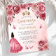 Diese schöne Quinceañera Einladung zeigt eine Grenze von rosa Rosen auf einem rosa Aquarell Hintergrund. Eine Goldtiara, ein brünettes Mädchen in einem rosa Prinzessenkleid und kleine rosa Schmetterlinge schmücken den Text. Das Wort "Quinceañera" und der Name des Ehrengast erscheinen in elegantem goldfarbenem Schriftzeichen, der Rest in grauem Sans Serif Schriftart.
