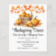 Eine Niedliche Erntedank-Illustration mit einem Korb voller Kürbis und bunten Herbstblättern auf der einen und Herbstplätzchen mit Blätter und Kürbissen auf der anderen Seite. Sie können diese Einladung mit Ihren Dinner-Details personalisieren.