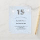 Eine moderne, stilvolle und glamouröse Einladung für eine Girl's Quinceañera, 15. Geburtstagsfeier. Babyblau, mit Imitaten verziert, silberfarbener Glitzer. Personalisieren Sie Ihren Namen und Ihre Party-Daten und fügen Sie diese hinzu. Nummer 15 wird mit einem Schriftart im Ballonstil geschrieben, Skript.