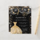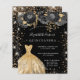 Eine moderne, stilvolle und glamouröse Einladung zu einer Quinceañera, 15. Geburtstagsfeier. Ein schwarzer Hintergrund mit Imitaten goldenen Glitzer Staub, ein Kleid und schwarz-goldene Rose, Blumenmuster. Der Name ist mit einem modernen handgeschriebenen Stilskript geschrieben. Personalisieren Sie Ihre Party-Daten und fügen Sie sie hinzu.