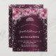 Eine moderne, stilvolle und glamouröse Einladung zu einer Quinceañera, 15. Geburtstagsfeier. Ein bordeauxrotes Imitat mit metallischem Hintergrund mit rosa Imitaten Glitzer Staub, eine Tiara Krone und rosa Blumen. Der Name ist mit einem modernen handgeschriebenen Stilskript geschrieben. Personalisieren Sie Ihre Party-Daten und fügen Sie sie hinzu.
