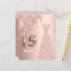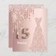 Elegant, klassisch, glamourös und mädchenhaft Stil Quinceañera, 15. Geburtstagseinladung. Eine Rose goldenes Kleid mit Imitaten Rose Gold Glitzer Tropfen. Rose Gold Imitate metallisch aussehend Hintergrund. Personalisieren Sie Ihren Namen und fügen Sie ihn vorne hinzu. Nummer 15 wird mit einem Schriftart im Ballonstil geschrieben. Fügen Sie Ihre Veranstaltungsdetails in schwarze, hintere Buchstaben ein.