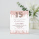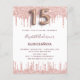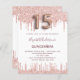 Eine moderne, stilvolle und glamouröse Einladung für eine Girl's Quinceañera, 15. Geburtstagsfeier. Ein schick weißer Hintergrund mit Rose Gold Imitate Glitzer Tropfen, Farbe Tropflook. Der Name ist mit einer modernen dunklen Rose goldfarbenen Handschrift geschrieben, die als Stilschrift dient. Personalisieren Sie Ihre Party-Daten und fügen Sie sie hinzu. Nummer 15 wird mit einem Schriftart im Ballonstil geschrieben, Skript.