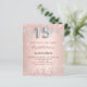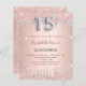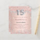 Eine moderne, stilvolle und glamouröse Einladung für eine Girl's Quinceañera, 15. Geburtstagsfeier. Ein Imitat Rose gold metallische Hintergrund mit Imitaten Rose Gold und Silber Glitzer. Der Name ist mit einer modernen dunklen Rose goldfarbenen Handschrift geschrieben, die als Stilschrift dient. Personalisieren Sie Ihre Party-Daten und fügen Sie sie hinzu. Nummer 15 ist mit einem silbernen Ballon Stil Schriftart geschrieben, Drehbuch.