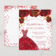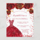 Eine moderne, stilvolle und glamouröse Einladung zu einer Quinceañera, 15. Geburtstagsfeier. Weißer Hintergrund mit Glitzern, rotes Kleid und rote Rosen, Blumenmuster. Der Name ist mit einem modernen handgeschriebenen Stilskript geschrieben. Personalisieren Sie Ihre Party-Daten und fügen Sie sie hinzu.