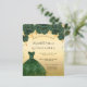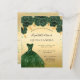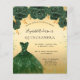 Eine moderne, stilvolle und glamouröse Einladung zu einer Quinceañera, 15. Geburtstagsfeier. Ein goldenes Imitat mit grünen Imitaten Glitzer Staub, ein smaragdgrünes Kleid und grüne Rose, Blumenmuster. Der Name ist mit einem modernen handgeschriebenen Stilskript geschrieben. Personalisieren Sie Ihre Party-Daten und fügen Sie sie hinzu.