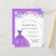 Eine moderne, stilvolle und glamouröse Einladung zu einer Quinceañera, 15. Geburtstagsfeier. Auf der Vorderseite ein weißer Hintergrund mit violettem, lila Glitzern, ein violettes Kleid. Der Name ist mit einem modernen handgeschriebenen Stilskript geschrieben. Personalisieren Sie Ihre Party-Daten und fügen Sie sie hinzu.