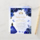 Diese schöne Quinceañera Einladung zeigt eine Grenze von königsblauen Rose auf blauem Aquarell. Eine goldene Tiara, ein dunkelhaariges Mädchen in einem königsblauen Prinzessenkleid und kleine blaue Schmetterlinge schmücken den Text. Das Wort "Quinceañera" und der Name des Ehrengast erscheinen in elegantem goldfarbenem Schriftzeichen, der Rest in grauem Sans Serif Schriftart.