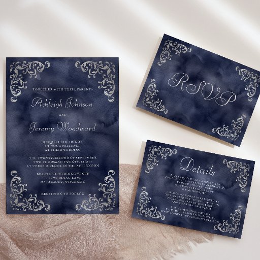 Diese Vintag inspiriert Hochzeitseinladung enthält den Text in einem hellsilbergrauen Drehbuch und Serif-Schriftart, gerahmt durch ein zartes Vintages Silberfolienmotiv in vier Ecken auf einem marineblauen Aquarellhintergrund. Der Rahmen und der Aquarellhintergrund werden auf der Rückseite wiederholt.
