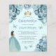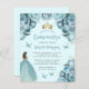 Dieses schöne Quinceañera-Erlebnis besticht durch die türkisfarbenen Blume auf helltürkisfarbenem Hintergrund. Eine Goldtiara, ein dunkelhaariges Mädchen in einem türkisfarbenen Prinzessenkleid und kleine türkisfarbene Schmetterlinge schmücken den Text. Das Wort "Quinceañera" und der Name des Ehrengast erscheinen in eleganter türkisfarbener Schrift, der Rest in grau sans serif Schriftart.