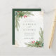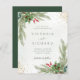 Schöne, erschwingliche Save the Date-Karte mit handgemalten botanischen Aquarellbildern aus Wintergrün, Kiefer- und Fichtenzweigen, Zapfen und holzigen Beeren mit vergoldetem Glitzer. Ideal für Hochzeiten im Winter oder Weihnachten.