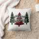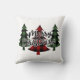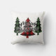 Dieses Kissen mit einem roten und zwei grünen Büffel karierte Weihnachtsbäume mit einem festlichen "Frohen Weihnachten" in dekorativen Schrift vor ihnen platziert.