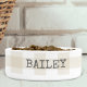 Diese personalisierte Hundeschale weist ein beige und weiße Büffel-Karo-Muster auf, das den Namen Ihres Hundes in einem grauen Retro-SchreibmaschinenSchriftart trägt. Das perfekte Begleiter-Accessoire, das sich perfekt in die Bauerndekoration passt.