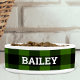Diese personalisierte Hundeschüssel weist ein grün-schwarzes Büffel-Karo-Muster mit dem Namen Ihres Hundes im Schriftart der weißen Serifen auf.