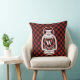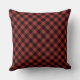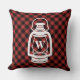 Ein Kissen, das ein rotes und schwarzes kennzeichnet kariertes Muster des Erbe (Büffel) auf Front und Rückseite. Front kennzeichnet eine weiße Illustration einer Öl-Campingslaterne. Personifizieren Sie die Initiale auf Laterne.