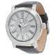 Geschenk für einen Baumeister. Der Erbauer ist mit Gebäude-Materialien um ihn herum stehend. Eine lustige Uhr für einen Bauunternehmer, Gebäude-Materiallieferanten oder Bauarbeiter. Stilvolle Geschenkuhr. Kühne römische Zahlen und ein schwarz, weiß und grau Armbanduhr Gesicht. Bauernuhr.