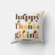 Farbenfrohe mutige Typografie Happy Thanksgiving fallen Farbe werfen Kissen. Es zeigt den Text "Happy Thanksgiving" in bunten Typografie, anpassbare Datum und Blätter in braun, orange, olivgrün und gelb.