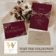 Romantische Bordeaux- und Goldkarte mit Blumenbezug, ideal für Hochzeiten im Herbst. Elegante Chinoiserie-Blume und zeitlose Kalligraphie machen dieses Hotel zu einem idealen Ort für Hochzeiten im Oktober oder Herbst.