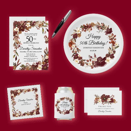 Burgund Red Mauve Herbst Blume 50. Geburtstag Pappteller