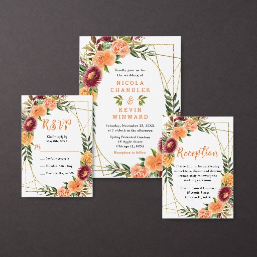 wedding rsvpgreenery foliagebotanical leavesautumn gardenfall rusticorange rosesburgundy redthanksgivingwatercolor stylefloral flowers