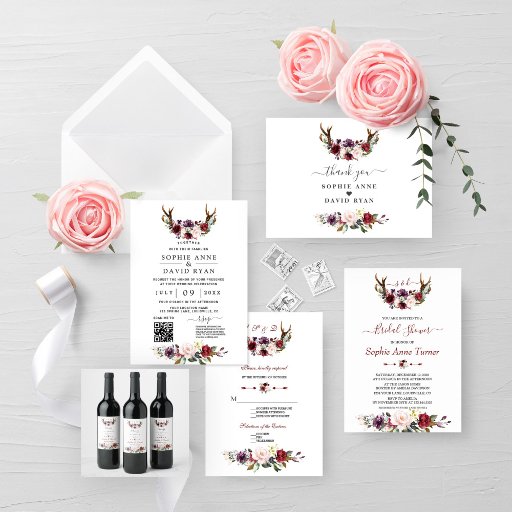 Rustikales Burgundy Floral Antlers Monogram Kartendesign mit herrlicher Aquarellbordee, Blüte, Pflaumenblumen, Pfeilen mit Herz und Blumenstrauß als Trenner, moderne Kalligraphie Initialen. Verwenden Sie das Tool Personalisieren, um Ihre Informationen hinzuzufügen. Für passende Artikel besuchen Sie bitte meine Burgundy Plum Floral Antlers Collection.