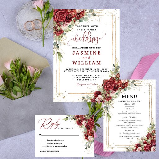 Burgundy Blush Gold Greenerity Wedding Menükarte