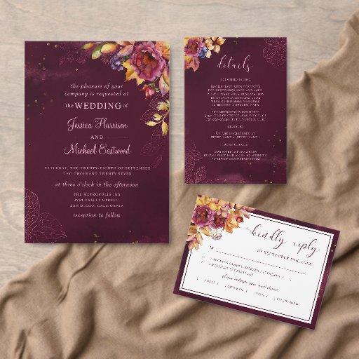 Watercolor Fall Floral Burgundy Rose Gold WeddingDesignt von Witty Betty