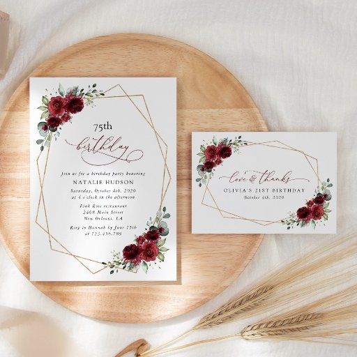Add a personal touch to your birthday celebration with these stylish and memorable party items! Design features burgundy watercolor flowers, greenery and gold frame on white background.