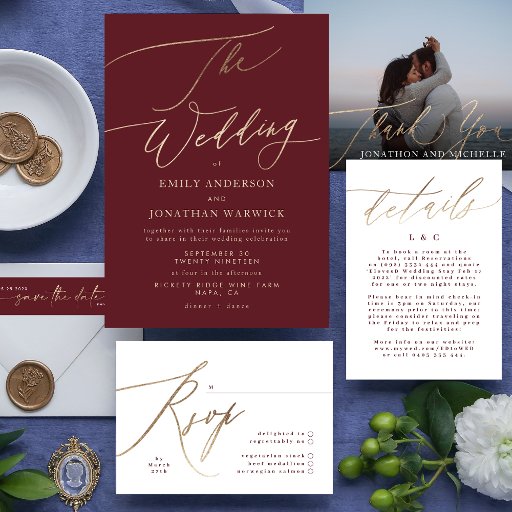 Burgundy & Gold Fall Calligrafy Foto Wedding Save The Date