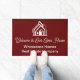 This professional realtor doormat is custom made with your real estate company name under the modern welcome in white cursive script for an open house. This chic custom burgundy realty business decor features a house logo image for home builder or realty agent company marketing.