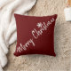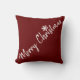 Burgundy Red Frory Weihnachten Schneeflocken Throw Kissen. Frohe Weihnachten in einem trendigen Skript. Auf der Rückseite sind weiße Schneeflocken auf bordeauxrotem Hintergrund zu sehen.
