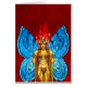 Eine königliche Königin. Krönt und bestickt mit leuchtend blauen Schmetterlingsflügeln, vor einem lebendigen roten Hintergrund. Für Fantasy- und Feenliebhaber.