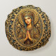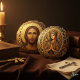 "This profound and richly detailed graphic is a striking religious icon portrait of Jesus Christ. The figure is set against a radiant golden halo and bordered by a magnificent, heavily textured 3D frame featuring intricate gold scrollwork and foliage, all beautifully contrasted against a deep teal or dark blue background. This design's luxurious and traditional feel makes it ideal for high-end wall art (canvas or wood prints), decorative prayer book or Bible covers, religious greeting cards for Christmas or Easter, memorial jewelry or tokens, or any product intended to express faith and spiritual art in a traditional and majestic style."