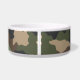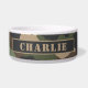 In diesem Wald getarnten Hundeschale in Khaki, Salbei, Grün, Braun, Bräunen und Schwarz wird Ihr Hund stilvoll essen. Personalisieren Sie mit seinem Namen in einer Battstencil Typografie auf schwarz. Perfekt für Hundebesitzer im Militär einfach nur passieren Liebe Camouflage Druck. Entworfen von Künstler ©Susan Coffey.