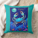 Pillow in an illustration of the Cancer zodiac sign featuring a large, blue crab with orange accents set against a starry night sky. A glowing full moon hovers above, while colorful, dreamlike sea flora fills the foreground.