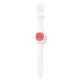 Armbanduhr in reflektierenden rosafarbenen Knickformen auf einer Grundfarbe rot.