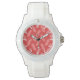 Armbanduhr in reflektierenden rosafarbenen Knickformen auf einer Grundfarbe rot.
